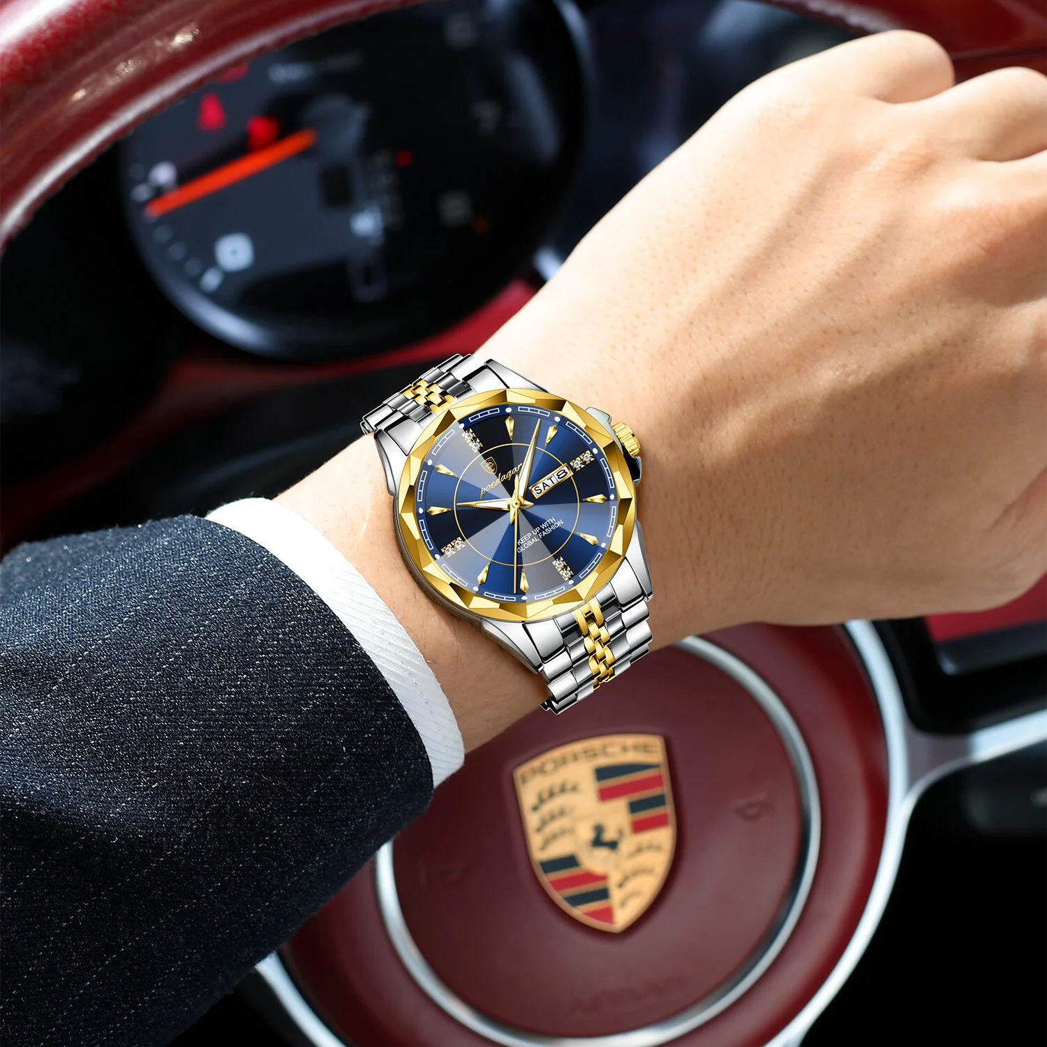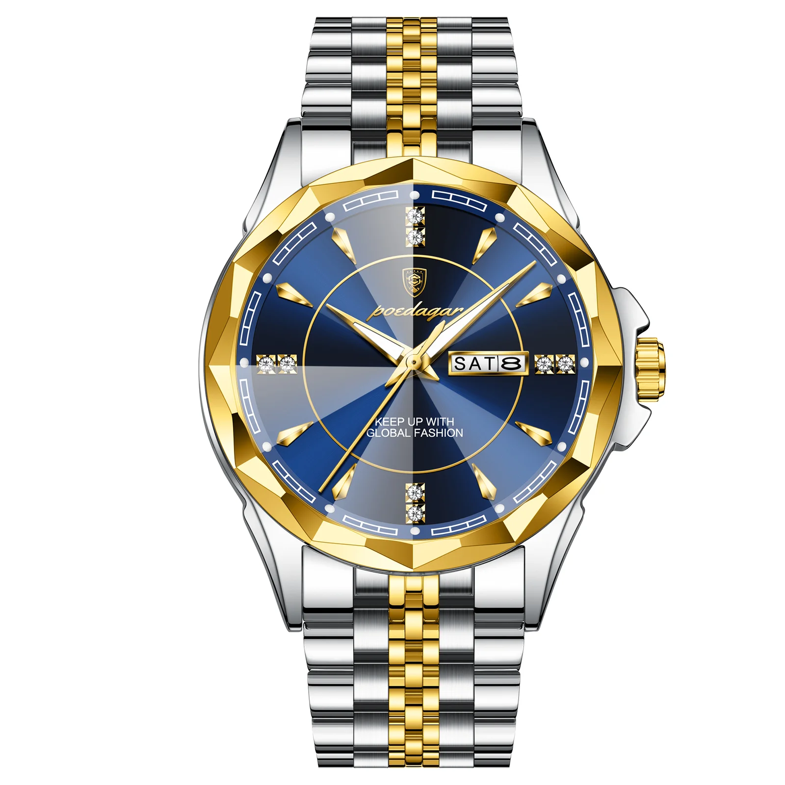 间金蓝面 POEDAGAR 674 Luxury Watch For Man Stainless Steel Date Week Quartz Men Clock